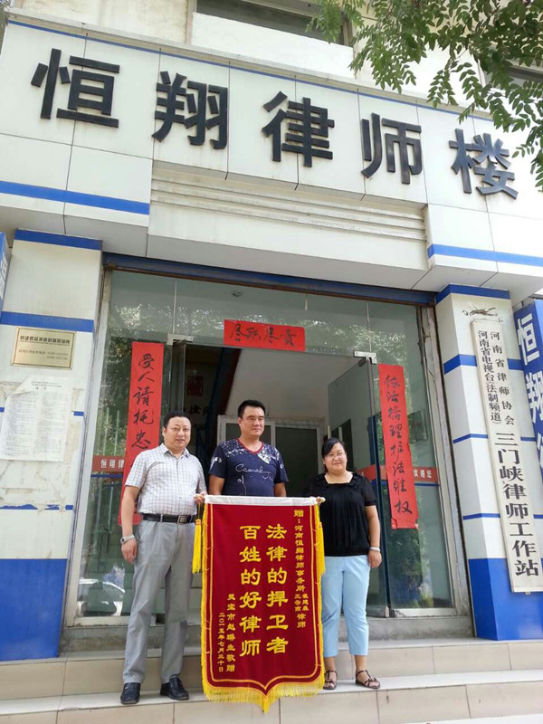2015年7月30日上午9點(diǎn)左右,當(dāng)事人趙某同家人來到河南恒翔律師事務(wù)所,燃放鞭炮,并當(dāng)面向所副主任崔建森及王云燕兩位律師贈送錦旗,錦旗上寫著“法律的捍衛(wèi)者 百姓的好律師”。